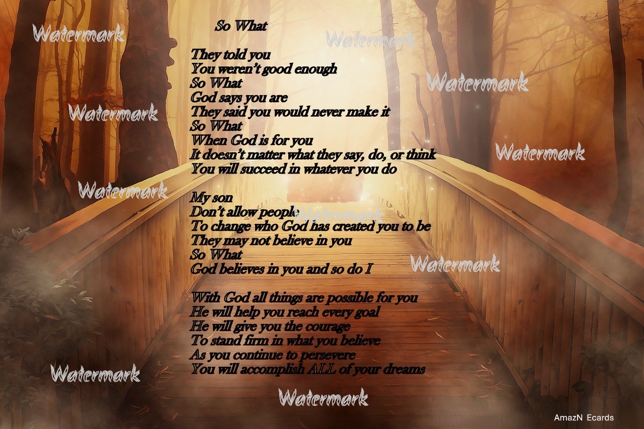 So What – Son Ecard by carydawn on June 27, 2018 with No Comments Send your son an ecard to encourage him to not be moved by the opinion of others. $5.50 – Add to Cart Checkout Added to cart